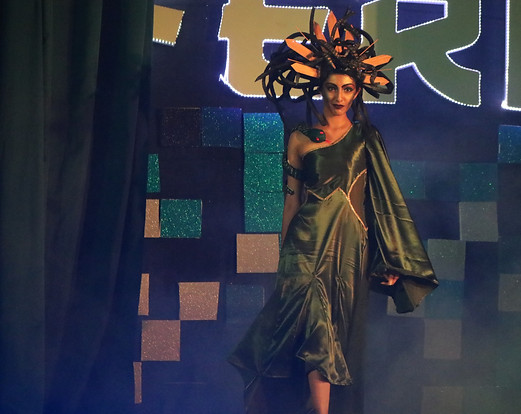 The ever-stylish Mistress Of Evil - Maleficent inspired us on our next dress. Given a whole black look her dress shouts power, fear, mystery, strength, authority, elegance, formality, death, evil, and aggression, rebellion, and sophistication. The wide neck cut shows of the model's collar bone and gives it a slinky look. The black cape is lined by silver sequence that shines giving the dress a whole new aesthetic, especially the image of a dragon!